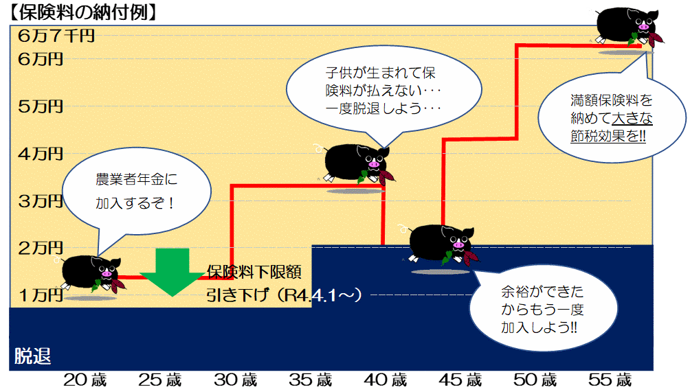 例えば,経営にゆとりがある時は保険料を増やし,経営にゆとりがない場合や出費がかさむ時期などは保険料を減らすといったことも可能であり,農業経営の状況や老後設計に合わせて保険料を選ぶことが可能です。