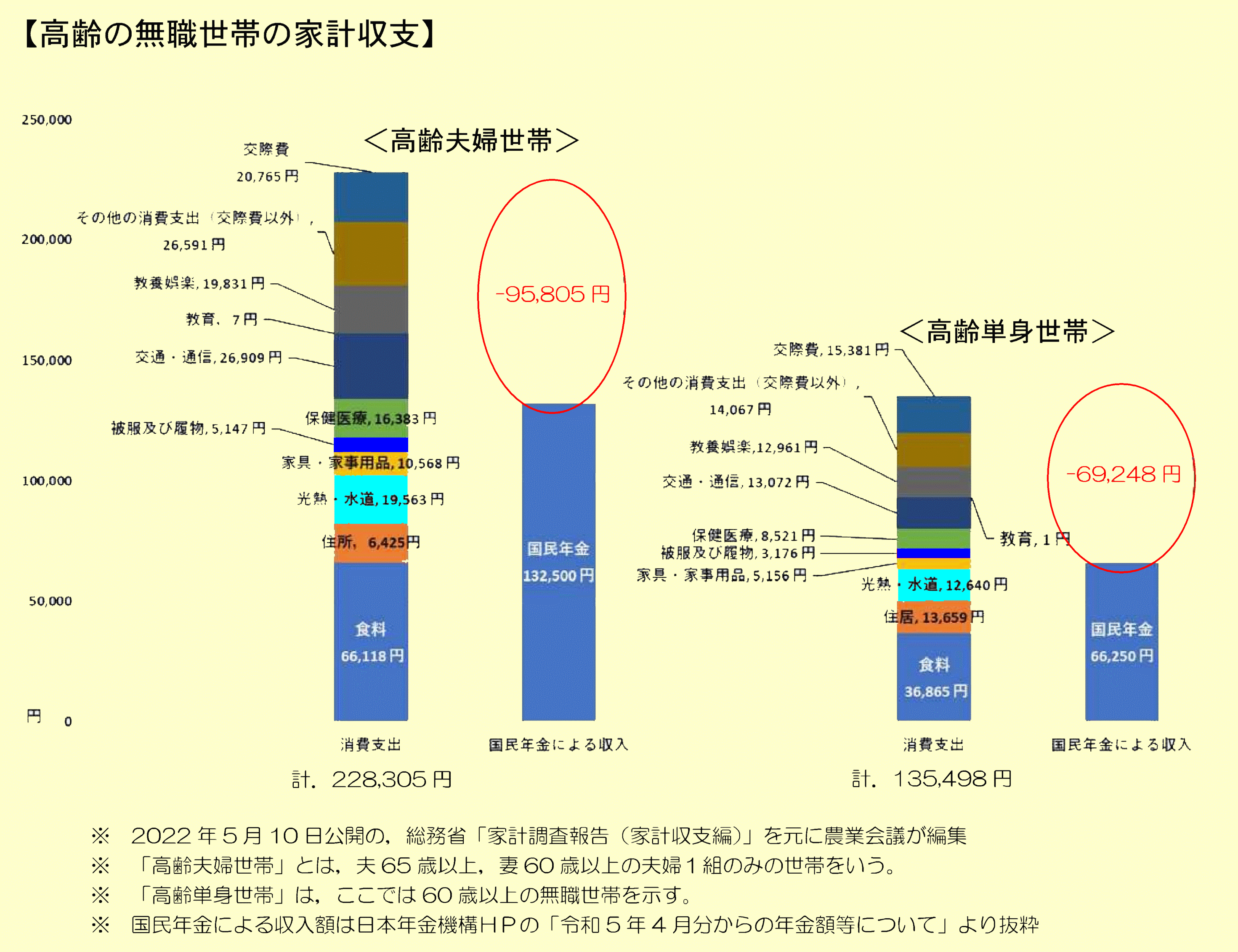 総務省の家計調査によると,高齢農家の夫婦2人の消費支出は月額23万円程度となっており,国民年金のみによる収入の場合は,1ヶ月あたり10万円程度不足することとなります。また,高齢単身世帯の場合は7万円程度不足することとなります。