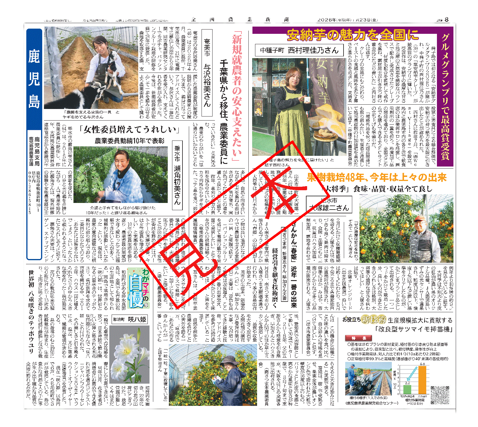 月4回金曜日に発行し, 1週間の農政の動きや現場で役立つ栽培技術・流通の情報・魅力的な農家の取り組みなど幅広く伝え, 担い手の皆様の経営発展に役立つ新聞です。